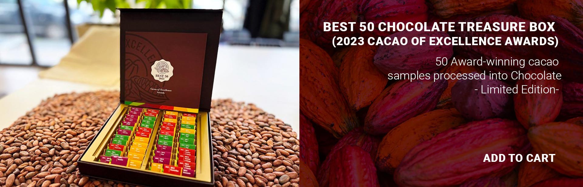 Discover the diversity of cacao and its flavours with the Cacao of Excellence Treasure Box (2023 Best 50).