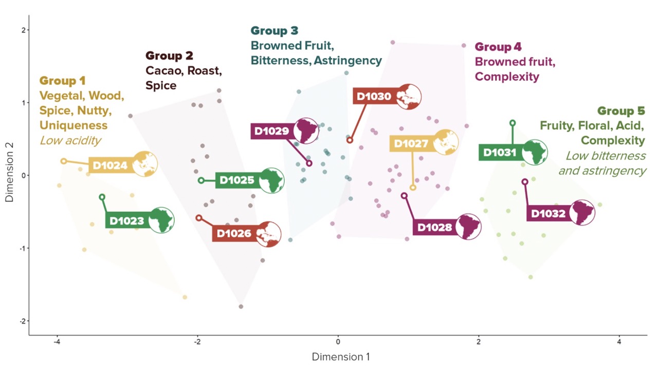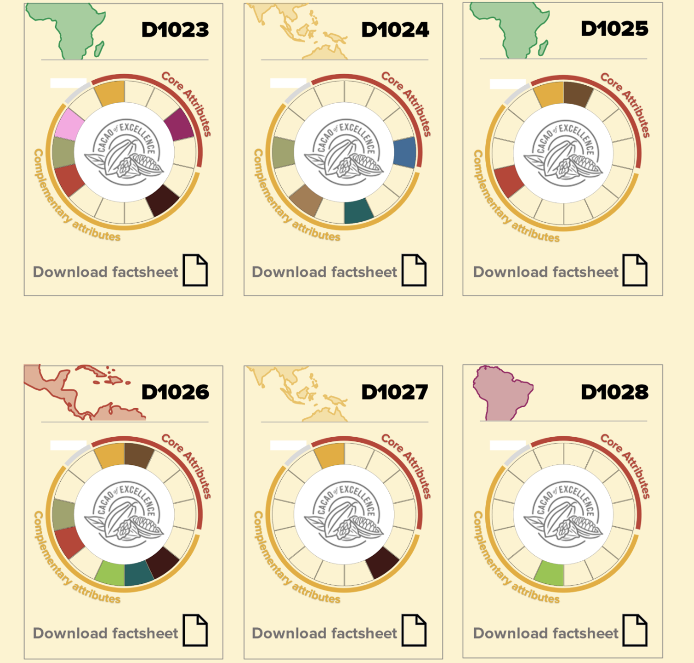 The samples included in the Diversity Kit represent a variety of cacao-producing regions and a range of flavour attributes. The selection is derived from an analysis of 2023 cacao sample evaluation results of the 2023 Technical Committee panel, where a sub-set of 109 samples crossing a threshold of Global Quality scores and with low to absent Off Flavours were considered.